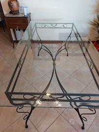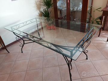 Tavolo in ferro battuto color nero antichizzato, superficie in vetro sagomato. 6 posti ma si sta comodi anche in 8. Misure : 1.74 ×94 h 75 Solo ritiro Sedie e suppellettili esclusi Tavolino uguale al tavolo escluso ( vendo a parte)