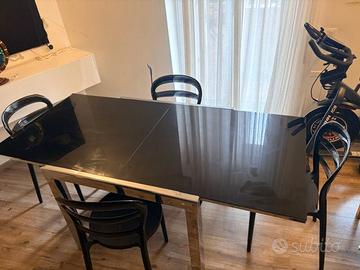 Vendo tavolo per salone 90x90 allungabile a 180 in cristallo nero e acciaio con quattro sedie
