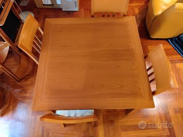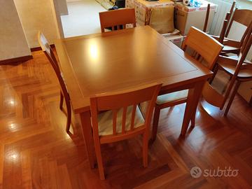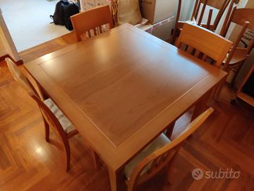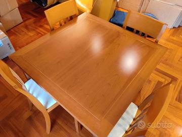 Tavolo quadrato interamente in legno di ciliegio con apertura a libro in buone condizioni, con segni di usura su gambe e piano. Misure: chiuso 105x 105cm, aperto 210x105cm. Vendo già smontato e meticolosamente imballato con pluriball e pellicola, pronto per essere ritirato. Se interessati vendo anche sedie abbinate in buone condizioni: https://www.subito.it/arredamento-casalinghi/4-sedie-in-legno-imbottite-roma-643798088.htm