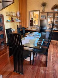 Bellissimo tavolo con eleganti capitelli in stile ionico posti a sostegno di un ampio e resistente piano in cristallo (10mm) lavorato a mano, misure 225x100, DIMENSIONI BASE: 48x48 H73, completo di 8 sedie in legno laccate nero con seduta in cuoio. (se interessati è possibile anche acquistare tavolino salotto abbinato, stesso capitello