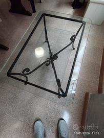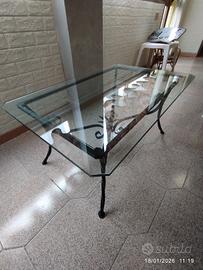 tavolo da salotto in cristallo molato 10mm. su base in ferro battuto e vetrinetta aperta sottostante.