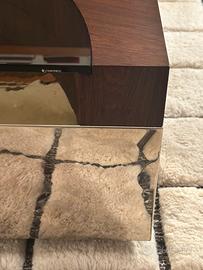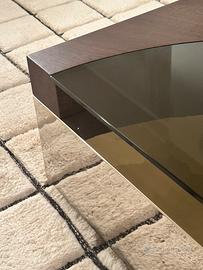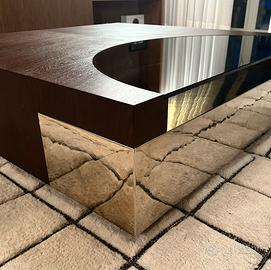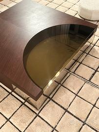 Tavolino salotto su misura, pezzo unico d’autore, in legno, metallo e vetro, 120x120x35 cm come nuovo