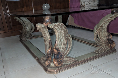 Bellissimo tavolo da salotto con piano in vetro spessore 1,2 cm (misure cm 100x150xh45,5) , base artigianale in legno lavorato. Vetrina in legno massello arte povera, misure 140x43xh189, ripiani in vetro. No spedizione.