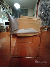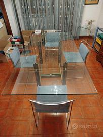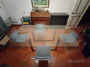 Tavolo Sarpi di Carlo Scarpa usato in ottime condizioni, design contemporaneo, in vetro float ad alto spessore su base in metallo trafilato satinato e viti brunite a vista, completo di n. 4 sedie in tubolare metallico e tessuto alcantara color carta da zucchero in ottime condizioni