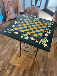 Tavolo artistico quadrato di raffinata manifattura, su base in legno, completamente decorato a mano, con materiali di qualità e tecnica innovativa che riproduce fedelmente l'effetto della Pittura di Pietra Rinascimentale, che in origine utilizzava pietre preziose per creare effetti cromatici unici. La scacchiera centrale presenta colori brillanti impreziositi da una cornice con motivi floreali (agrumi) alternati a farfalle. Il tavolo può essere facilmente combinato con arredamento antico o moderno. Pezzo unico non riprodotto in serie. Misure: Superficie = 61 x 61 cm Spessore = 2,3 cm. Il supporto in metallo non e’ incluso nel prezzo e ha il solo scopo di presentare il prodotto. Prezzo promo.