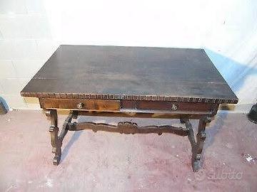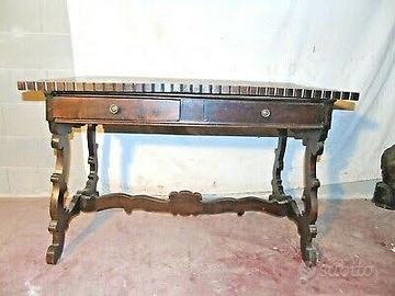 Vendo affascinante scrivania antica in legno massello, caratterizzata da una linea elegante e da particolari lavorazioni e ben conservata, con un piano rifinito da una cornice dentellata che ne esalta il carattere artigianali. Il mobile presenta una struttura solidad’epoca.