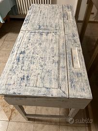 Tavolo scrittoio mobile console in legno stile shabby chic con finitura bianca anticata, caratterizzato da un design rustico che include cassetti e scomparti per contenere oggetti.