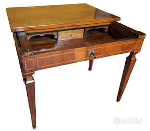 Prezioso ed introvabile tavolo scrittoio secretaire Luigi XVI da centro, realizzato in noce con eleganti tarsie in legni vari quali mogano, bosso, ciliegio e bois de rose, costruito in ambito lombardo nella seconda metà del XVIII secolo e ripristinato in patina.