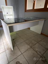 Vendo come da foto tavolo/scrivania bianco con vetro fantasia. Tavolo misura 150cm x 90cm x 77cm H Il vetro è 150cm x 80cm quindi rimane un pò piú stretto del tavolo. Trasporto a carico dell’acquirente.