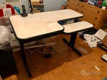 Tavolo scrivania con struttura in metallo nero e ripiani bianchi con bordi neri, molto robusto e resistente, ideale come appoggio per computer e tastiera, vendesi in centro a Forlì per cambio arredamento. Misure: 120 x 70 cm, altezza 77 cm; ripiano tastiera 25 x 60 cm; presente ulteriore ripiano sulla parte posteriore da 16 x 64 cm per appoggio prese multiple o altro. Lampada da computer già fissata al tavolo in omaggio.
