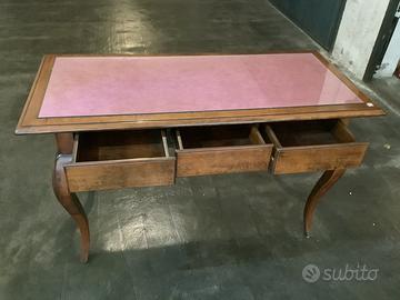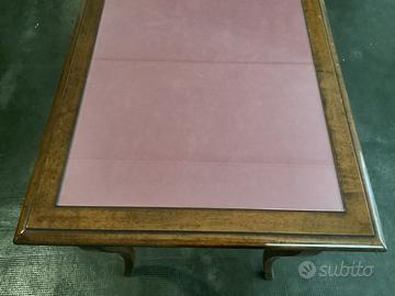 Elegante tavolo massello con parte superiore in cristallo sopra panno rosa antico. Usato come piano espositore in gioielleria con 3 comodi cassetti. Misure 150 x 70 H 87 Misure cassetti 38 cm