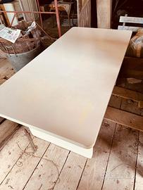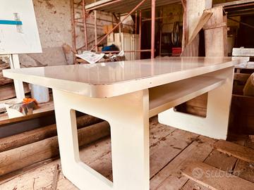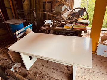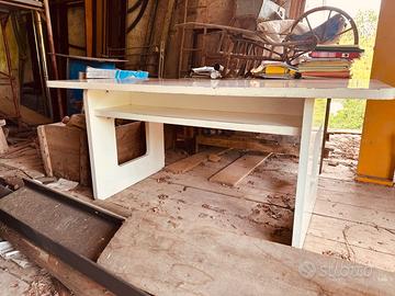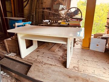 Vendo tavolo/scrivania in legno di design - vintage/industriale, ideale sia come postazione di lavoro che come tavolo da laboratorio, studio o complemento d’arredo. La struttura, solida e stabile, è dotata di un pratico ripiano inferiore su entrambi i lati, utile per riporre libri, documenti o oggetti vari. Le linee essenziali lo rendono adatto a diversi ambienti: casa, ufficio, studio creativo o garage. Il tavolo presenta segni del tempo e dell’utilizzo (come da foto). Caratteristiche: • Materiale: legno verniciato • Misure: H80 x L180 x P89 cm • Colore: bianco • Ripiano inferiore portaoggetti • Struttura robusta