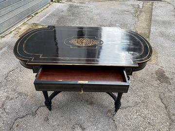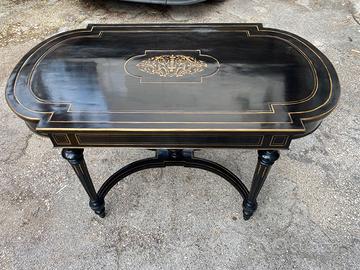 Tavolo stile Impero prima metà 800 in legno ebano con intarsi e bordi ottone dorato. Misura cm 135x73 restaurato
