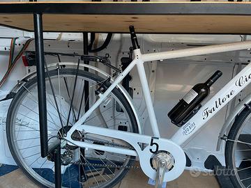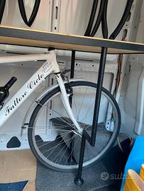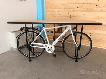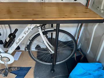 Tavolo scrivania artigianale con ripiano in legno color noce sostenuto da bicicletta. La bicicletta è funzionante, priva di manubrio e sella. Tavolo adatto come scrivania o piano lavoro. Misure ripiano cm 230 x 50, altezza 90.Tavolo Ritiro presso Iseo BS