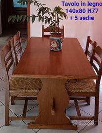 vendo tavolo in legno in ottime condizioni 140×80 - H 77 completo di 5 sedie impagliate ( volendo si possono aggiungere 2 sedie di legno impagliate, ma non dello stesso set) Due sedie con seduta usurata Ritiro a carico dell'acquirente