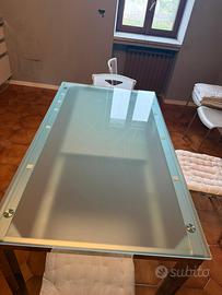 Tavolo allungabile con piano in vetro opaco e n. 6 sedie in plastica bianche