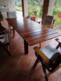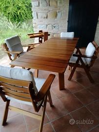 1 tavolo allungabile, 4 sedie regolabili con braccioli e cuscini, 1 carrello. Legno Iroko. Ritiro in loco.