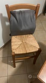 La seduta originale visibile sotto i cuscini grigi sembra essere in paglia di riso o palustre, tipica dello stile rustico italiano.
