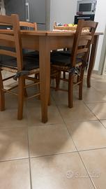 Tavolo: Si tratta di un tavolo rettangolare in legno con finitura color ciliegio. Le gambe hanno una forma leggermente sagomata (a "sciabola" o "spillo"),