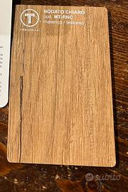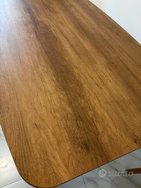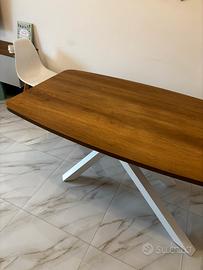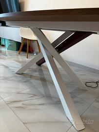 Tavolo Origami Sedit con gambe bianche e una bordeaux. Piano materico nodato chiaro (colore Tomasella) come da foto