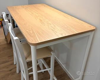 Vendo tavolo nuovissimo di design, acquistato da IKEA, mai utilizzato e in ottime condizioni. Le dimensioni sono: altezza 105 cm, larghezza 130 cm, profondità 70 cm. Struttura in acciaio verniciato bianco, con piano effetto legno rovere chiaro. In abbinamento, includo due sgabelli nuovi, ancora imballati, acquistati separatamente: struttura in legno bianco e seduta in pelle beige. Un set elegante, moderno e perfetto per ogni ambiente. Contattami per informazioni o per visionare il prodotto!