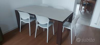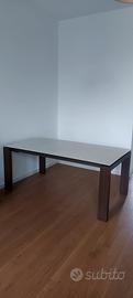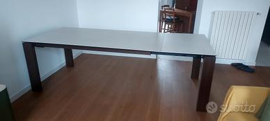 Tavolo allungabile con piano in ceramica MAI USATO (Valore ivato nuovo: 2.800 euro) Struttura e gambe perimetrali in legno. Piano rettangolare in ceramica. Il tavolo SIGMA racchiude al suo interno un ingegnoso meccanismo in grado di ampliare la superficie d'appoggio. Tirando verso di se la struttura, le due gambe dotate di ruote nascoste scorrono da un lato permettendo di estrarre l'allunga. Con un semplice movimento a rotazione l'allunga montata su binari in metallo esce dal suo alloggiamento e si allinea al piano. Le gambe a sezione rettangolare restano sempre perimetrali garantendo il massimo confort a tutti i commensali. Misure: 180x100 (allungato 240)