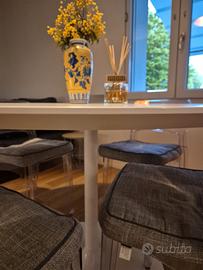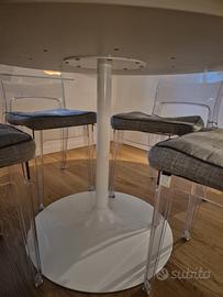 Il piano del tavolo è in legno laccato bianco, scegliamo questo colore perché è molto facile da abbinare, la sua finitura lucida è ottima per creare ambienti di lusso di fascia alta, la base in fusione di alluminio, un materiale caratterizzato dall'essere molto leggero ma al allo stesso tempo molto resistente e di incredibile durezza non permetterà nemmeno ai bambini più cattivi di romperlo.