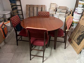 Vendo tavolo soggiorno interamente costruito in legno teak risalente agli anni ‘60 in ottime confizioni, completo di 4 sedie con struttura in teak da rifoderare per inutilizzo. Tavolo del diametro di 113 cm estensibile mediante 2 appendici richiudibili in teak.