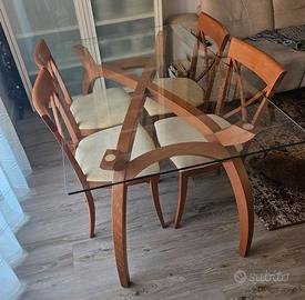 Vendesi elegante tavolo per soggiorno cm. 150x90 in cristallo e legno ciliegio massiccio con 4 sedie in alcantara color giallo paglierino