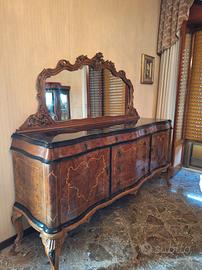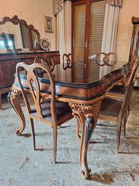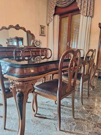 Set sala da pranzo composto da credenza con specchiera in stile Chippendale, + tavolo rettangolare con piano laccato nero decorato e sedie abbinate con schienale sagomato,completo di una grande specchiera intaglia caratterizzata da intarsi in radica e forme mosse. Ritiro e trasporto a vostra cura.