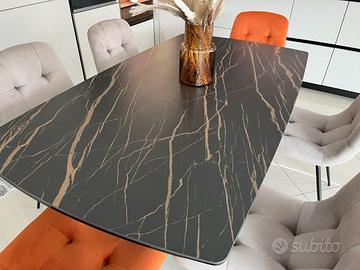 Tavolo con piano a botte in vetro ceramica in finitura ” Noir Desir opaco” basamento ad incrocio in metallo verniciato nero . Il seguente tavolo presenta due allunghe a tiro da 35cm cad 1 Dimensioni : 160 x 90 aperto 230 cm – H 76 cm ___________________________________ Restiamo disponibili ai seguenti numeri Mostra numero Mostra numero anche Whatsapp