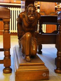 Con intagli elaborati: fascia sotto il piano del tavolo con motivo intagliato e gambe del tavolo con forme scolpite, che richiamano figure mitologiche.
