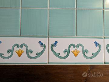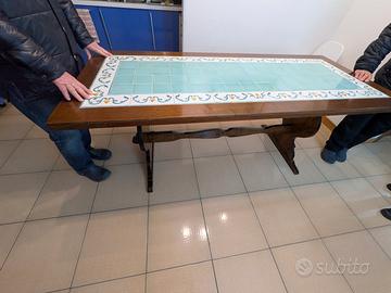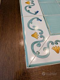 Superficie tavolo con decorazioni in ceramiche di Montelupo dipinte a mano, che risultano a filo rispetto alla cornice di legno esterno: unico piano senza dislivelli.