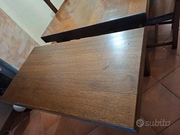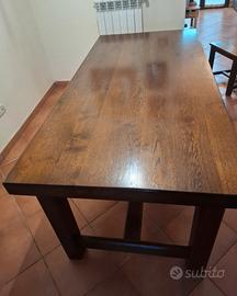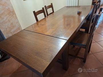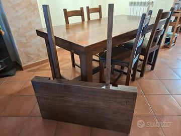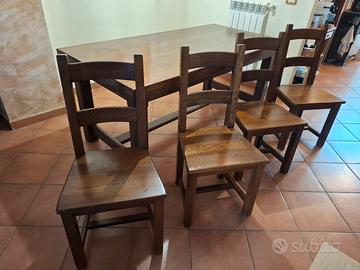 Tavolo in legno massello. Lavorazione artigianale. Dimensioni 179 x 89 cm. Dispone di una prolunga (stesso legno e fattura) per estensione a cm 227. Spessore tavola cm 7. Altezza cm 78. Corredato con 6 sedie legno massello. (altezza seduta cm 46. Possibilità di vendita disgiunta Sedie 40€x6=240€ Tavolo 300€ Tavolo + 6 sedie 500 Tavolo e sedie presentano normali segni di usura da utilizzo. Disponibili ulteriori foto su richiesta. Ritiro a carico acquirente.
