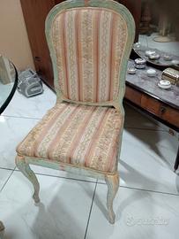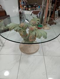 tavolo in stile veneziano con tronco in legno scolpito, vetro cm1,40di diametro per 2 cm di spessore completo di 4sedie a tema con tappezzeria da rifare.