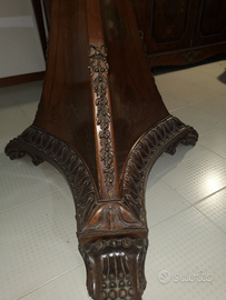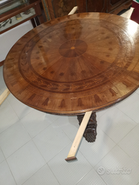 Tavolo rotondo da gioco intarsiato. Rifiniture in ottone. Comprese due mezze lune. Misure: Diametro: 125cm. Altezza: 73cm. Lunghezza con le due mezze lune: 190cm.
