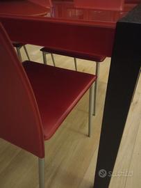 Vendesi a Noventa di Piave tavolo ALLUNGABILE firmato Target Point in vetro temperato rosso e la base è in ferro di colore legno marrone scuro,con sistema telescopico di allunga,con due allunghe in legno da 35 cm. Tavolo misura 85×143 chiuso,con una allunga diventa 178cm,con 2- 213cm. Tavolo compreso di 4 sedie in pelle rossa. Stato ottimo a 590€.