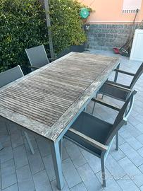 Vendo set completo da esterno composto da: Tavolo in alluminio e legno elegante e resistente, Dimensioni: Lungo 200 cm, Largo 100 cm – estensibile, 6 sedie abbinate, comode e in ottimo stato. Ideale per giardino, terrazzo o veranda.