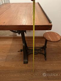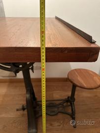 Vendo tavolo tecnigrafo industrial con piano regolabile per orientazione, altezza e inclinazione (100x70 cm). Sedile incorporato nella base del tavolo e regolabile in altezza (orientabile), sponge lateralmente dal piano, circa 25 cm. L‘Altezza del piano è regolabile (da circa 81 a 107 cm). Struttura in ferro e piano in legno massello.