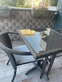 Venfo tavolo terrazzo, formato 67x67, altezza ripiano cm. 73, con ripiano in vetro. Vendo con due sedie e relativi cuscini. Tenuto in buono stato. Ritiro solo a mano.