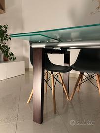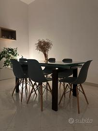 Tavolo da 6 a 10 posti con piano in cristallo opalino verde e gambe legno scuro. Design tipo Calligaris Misure chiuso 160x90 cm Aperto: 220x90 Completo di sei sedie in plastica grigia con gambe legno chiaro, modello tipo Vitra