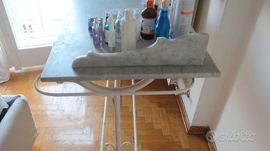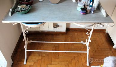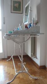 Disponibile tavolo lavabo toeletta da camera vintage, con struttura in ferro e ripiano di marmo, dotata di due porta catini a scomparsa e uno specchio basculante con cornice in legno, in condizioni come da foto, a 90euro. Shabby chic - cottage chic - vanity table - tavolo da trucco. Misure Larghezza totale 125 cm Larghezza tavolo 115 cm Altezza tavolo 80 cm + 67 cm di specchio Profondita’ 57 cm Diametro struttura per catini 32 cm Disponibile altro mobilio e arredamento tra gli annunci (tavolo, quadro, mensole in ferro, mobilio cucina e bagno, letto matrimoniale, cassettiera, poltrona, appendiabiti, libreria, ecc…). Possibilità di consegna a domicilio in zona Trieste previo accordo economico. Si valutano ribassi su piu’ acquisti Se interessati o per maggiori informazioni scriveteci Marco&Simone
