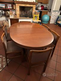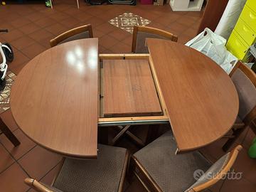 Vendesi set completo composto da tavolo circolare allungabile e 6 sedie abbinate in legno con seduta imbottita. Il set è molto solido e ben tenuto.