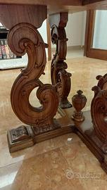 Tavolo da pranzo tondo, allungabile ovale, stile classico in noce massello, 4 zampe intarsiate e "pigna" centrale, ottimo stato, originale anni 60