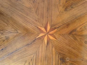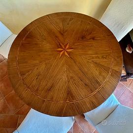 Vendo elegante tavolo tondo d'epoca, realizzato in legno di noce con piano a intarsio e stella centrale, produzione artigianale italiana di fine 800- inizio 900 sec.