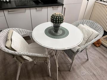 Vendo tavolo in ferro battuto bianco Ikea (chiudibile) +2 poltrone in vimini bianche Ikea. in buono stato. *Tavolo dimensioni: 75 cm diametro per 75 cm di altezza *Sedie, dimensioni: 45 cm di profondità per 56 cm di larghezza.