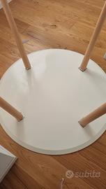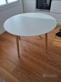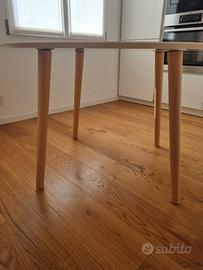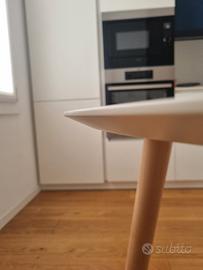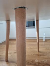 Piano laccato bianco con bordo smussato. Gambe inclinate in legno massello di faggio finitura ad olio