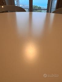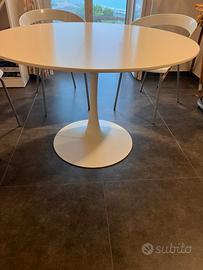 Tavolo tondo color bianco, piede centrale come da foto Diametro 110 cm Altezza 70 cm Presenta qualche graffio in controluce al centro.