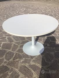 Tavolo bianco tondo, raggio 120 cm. Piano in legno e basamento in ferro. Possibilità di consegna