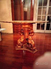 tavolo tondo con piano in onice e base intagliatoa